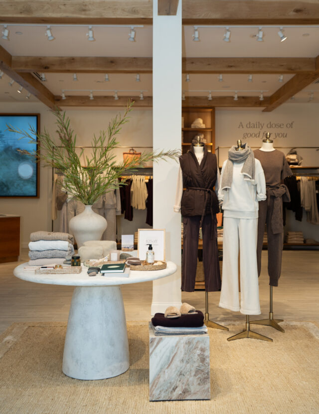The store design reflects the brand’s essence of mindful living. Handcrafted and sustainable details sourced globally make the space feel personal and intentional. Inviting dressing rooms feature custom-made scribed arched doors and inspiring hand-done collages while branded wall statements and ambient seasonal video content create a calming sensory experience.