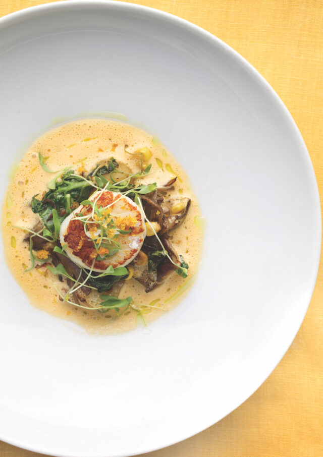 Roasted Montauk sea scallop with coconut masala, charred cabbage, mushroom, corn with coriander and orange by Michael Rozzi, executive chef at East Hampton’s The 1770 House