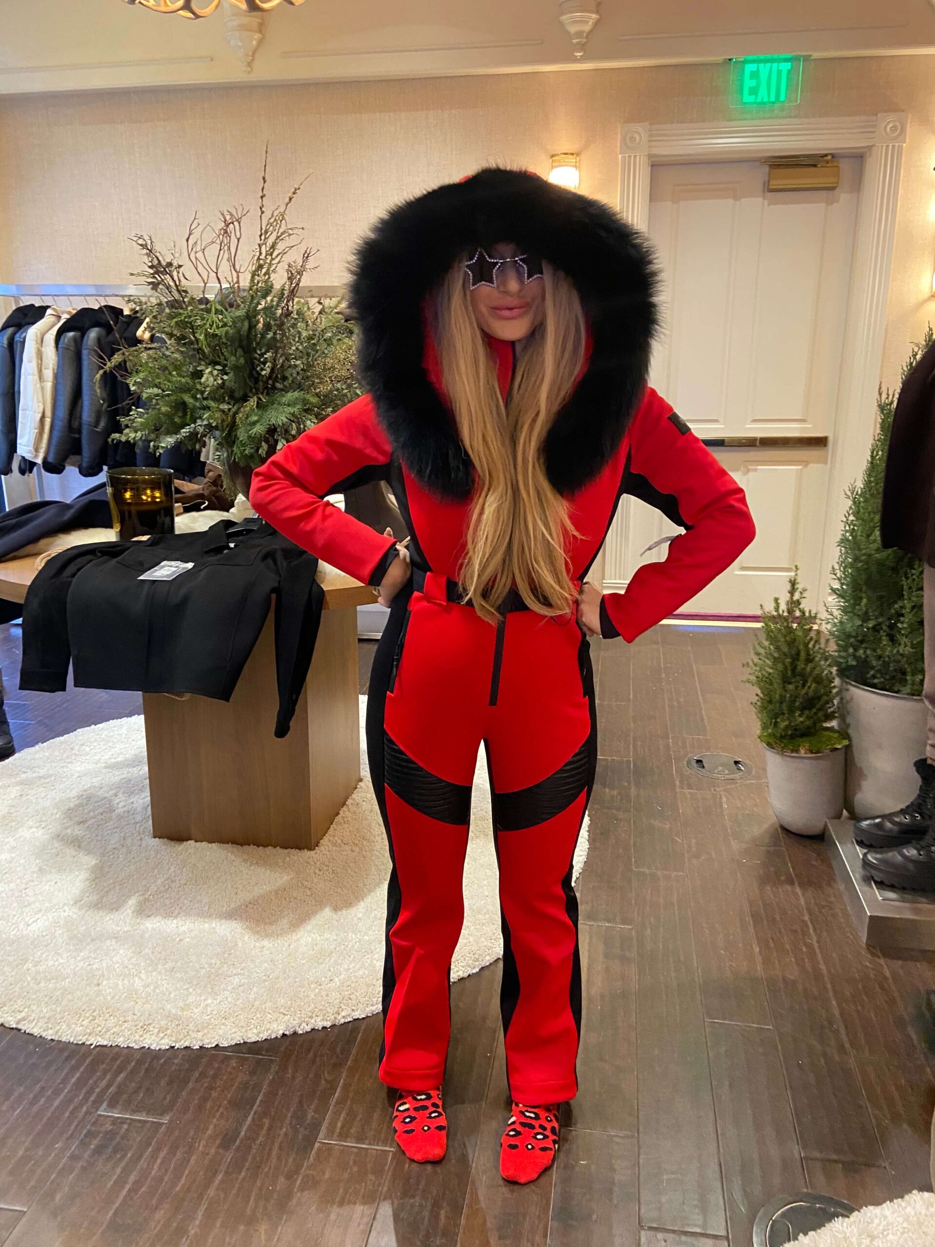 The collection felt perfectly at home in Aspen, featuring elevated skiwear, beautifully tailored peacoats trimmed with shearling collars and leather pocket detailing, and striking retro-inspired one-piece ski suits that nodded to alpine glamour of decades past.